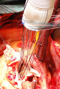 バルサルバ洞の壁と大動脈弁を切除し、一旦、冠動脈も切り離す。