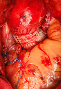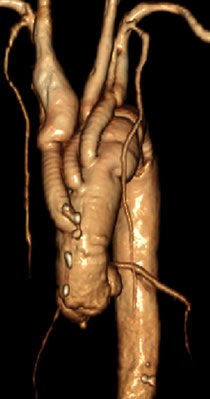 大動脈弓部は人工血管に置換され、弓部大動脈から分岐する頭部・上肢への枝も人工血管で再建。
